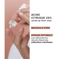 L'acide citrique interagit avec les mécanismes naturels de la peau en stimulant le processus de renouvellement cutané : la littérature scientifique indique que l'acide citrique à 20% augmente l'épaisseur de l'épiderme vivant, en induisant l'apoptose des cellules, et a également un effet peeling (élimination des cellules mortes), pour un effet peau neuve global. (1)(2)