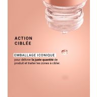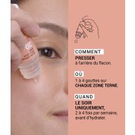 Pressez la base du flacon et appliquez la quantité suivante directement sur la peau du visage : - 4 gouttes sur l'ensemble du visage, - ou 1 goutte sur chaque zone particulièrement préoccupante (pores dilatés, petites imperfections).