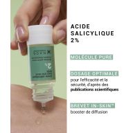 L'acide salicylique, puissant kératolytique, facilite la desquamation par une action biologique sur les cornéodesmosomes (qui lient les cellules de la couche cornée). L'acide salicylique inhibe également l'enzyme cholestérol sulfotransférase, qui modifie la composition du ciment intercellulaire et accentue la desquamation. Cette desquamation permet de limiter l'accumulation de cellules susceptibles d'obstruer les pores, limitant ainsi le développement de nouvelles imperfections. En régulant le mécanisme biologique de renouvellement de la fonction barrière (desquamation), l'Actif Pur Acide Salicylique 2% réduit visiblement les imperfections et affine le grain de peau.