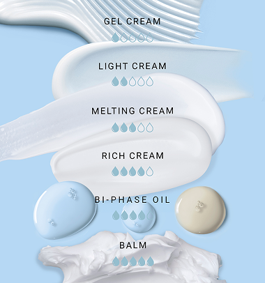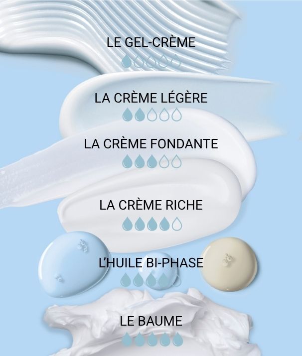 ✔ Choisissez parmi 6 textures pour répondre aux besoins et préférences de votre peau. Suivez notre indicateur hydratation/nutrition : 1 goutte pour la texture la plus légère, 5 pour la texture la plus riche.