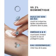 Notre ingrédient biomimétique pour nourrir intensément la peau et préserver son film hydrolipidique : L'HUILE DE RIZ, composée d'omégas 3, 6 et 9. Ils nourrissent en mimant les lipides de la peau.